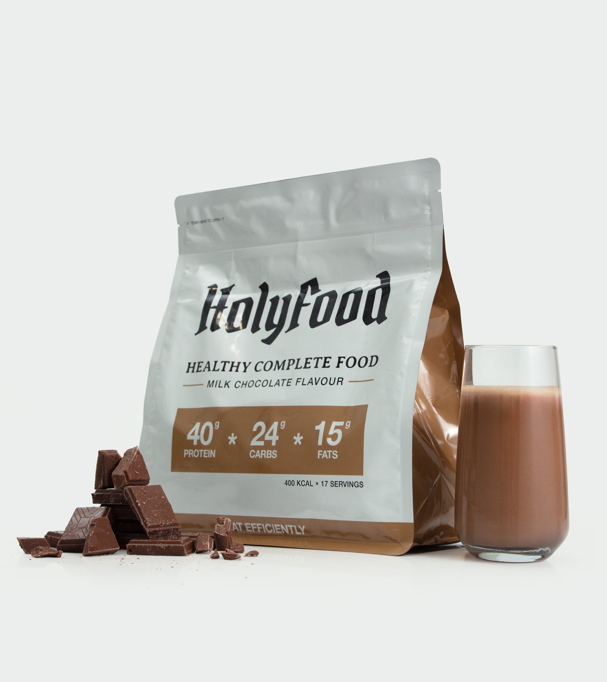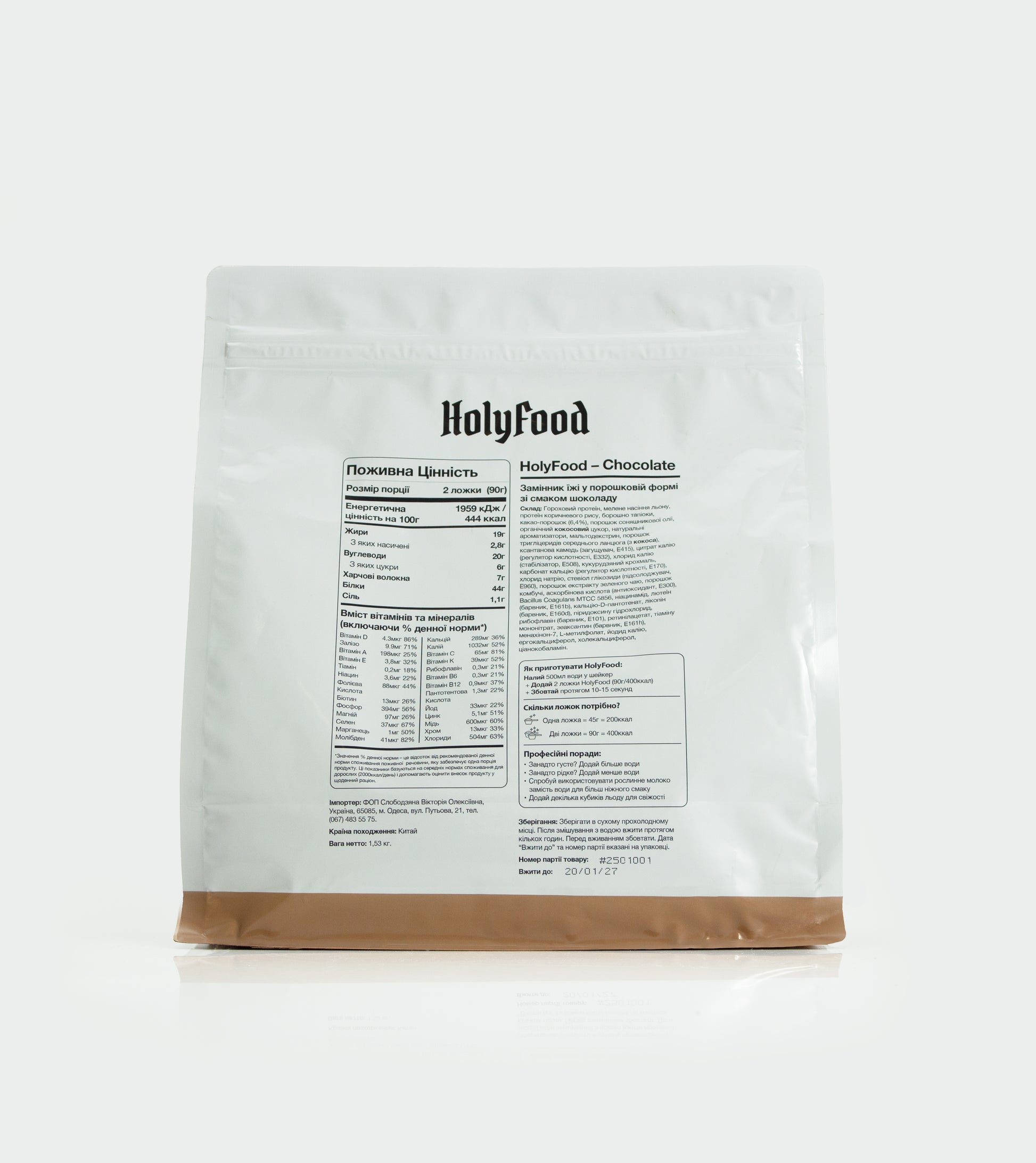 HolyFood розроблений таким чином, щоб забезпечувати організм всіма необхідними поживними речовинами у зручній формі. Він містить високоякісні інгредієнти, такі як протеїн гороху та коричневого рису, лляне насіння та порошок з кокосу, і не містить штучних підсолоджувачів чи консервантів.